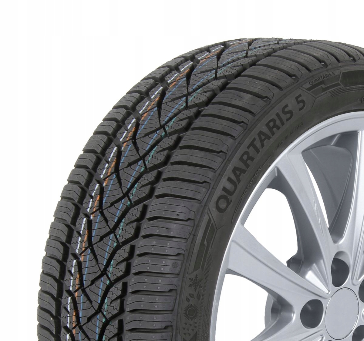 BARUM Quartaris 5 – Sezon się zmienia, bezpieczeństwo pozostaje BARUM Quartaris 5 to całoroczna opona, stworzona z myślą o samochodach miejskich, zapewniająca bezpieczną jazdę i zrównoważone osiągi bez względu na warunki. Zoptymalizowany pod kątem warunków zimowych bieżnik, wyposażony w sieć różnorodnych lameli, wspomaga przyczepność na ośnieżonych drogach, skracając tym samym drogę hamowania. Podróżowanie w zimowym krajobrazie staje się bardziej efektywne i bezpieczne. Za precyzję prowadzenia i stabilność pojazdu na mokrych nawierzchniach oraz podczas pokonywania zakrętów odpowiadają wzmocnione strefy barkowe z usztywnieniami międzyblokowymi bieżnika, które utrzymają pojazd we właściwym torze jady, nawet przy gwałtownych manewrach. Specjalnie zaprojektowane rowkowanie bieżnika, składające się z szerokich rowków obwodowych i węższych rowków poprzecznych oraz optymalnego rowkowania na barkach opony, jeszcze skuteczniej odprowadzają nadmiar wody podczas jazdy przez co opona wykazuje wysoką odporność na aquaplaning. BARUM Quartaris 5 to ciekawa propozycja dla kierowców poszukujących uniwersalnej opony, zapewniającej optymalne osiągi w każdych warunkach, która dodatkowo lokuje się w przystępnym przedziale cenowym. FAQ Jakie są główne zalety opon Barum Quartaris 5? Opony Barum Quartaris 5 to model całoroczny, który z powodzeniem może być użytkowany w samochodach miejskich i kompaktowych klasy średniej i wyższej. Ogumienie wyróżnia się unikatowym wzorem bieżnika w kształcie jodełki, który bardzo dobrze odprowadza wodę i zanieczyszczenia podczas jazdy. Dzięki temu opony zapewniają stabilną jazdę i zmniejszają ryzyko wpadnięcia w poślizg. Model charakteryzuje się również utrzymaniem optymalnej elastyczności i sztywności o każdej porze roku, a także doskonałym tłumieniem nierówności. Ze względu na te cechy opony wyróżnia wysoki poziom komfortu w czasie jazdy i zachowanie oczekiwanego poziomu bezpieczeństwa. Jakie certyfikaty i atesty mają opony Barum Quartaris 5? Model Barum Quartaris 5 uzyskał bardzo dobre wyniki w badaniach efektywności paliwowej, zdobywając kategorie C. Oznacza to, że opony wykazują umiarkowane opory toczenia, co przekłada się na redukcję poziomu spalania oraz zminimalizowanie emisji CO2 do atmosfery. Co więcej, wśród etykiet umieszczonych na tym modelu można znaleźć notę C w kategorii przyczepności na mokrej nawierzchni. Determinuje ona zachowanie ogumienia na drogach, na których zalega woda. Uzyskana ocena wskazuje na satysfakcjonujący wynik tego modelu w testach sprawdzających. Jakie rozmiary opon Barum Quartaris 5 są dostępne? Opony Barum Quartaris 5 dostępne są w wielu rozmiarach, dlatego z łatwością można dopasować je do swojego pojazdu. Występują w rozmiarach od 13 do 18 cali oraz szerokościach 155 do 230 milimetrów.